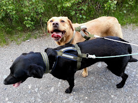 Men, så i dag, tenkte jeg plutselig at jammen skal jeg prøve igjen - med begge to. Og det funka SÅ bra! Carmen finner seg plassen nærmest sykkelen og har slakk line der i sitt fine og rene trav. Petra vil holde seg på yttersiden og ha litt avstand til sykkelen, og får sidelengs strekk i lina, men ikke verre enn at det går.