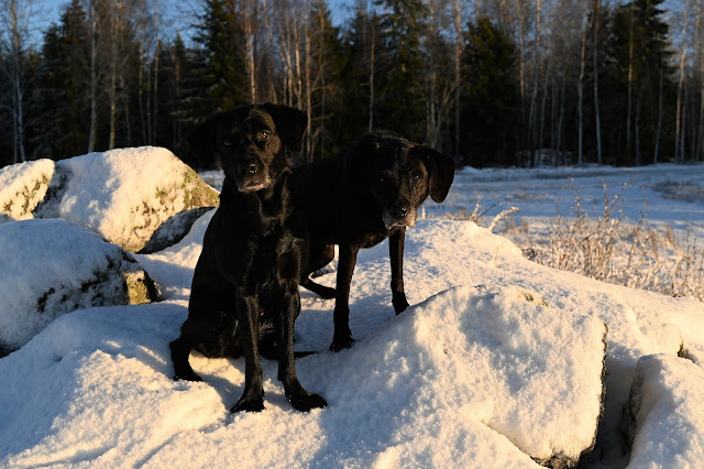 Disse to damene mener jeg har drevet med dyremishandling de siste par dagene, når det har vært minus 15 grader. I går bestod mishandlingen av mangel på potesokker – det var kaldt å løpe i snøen.